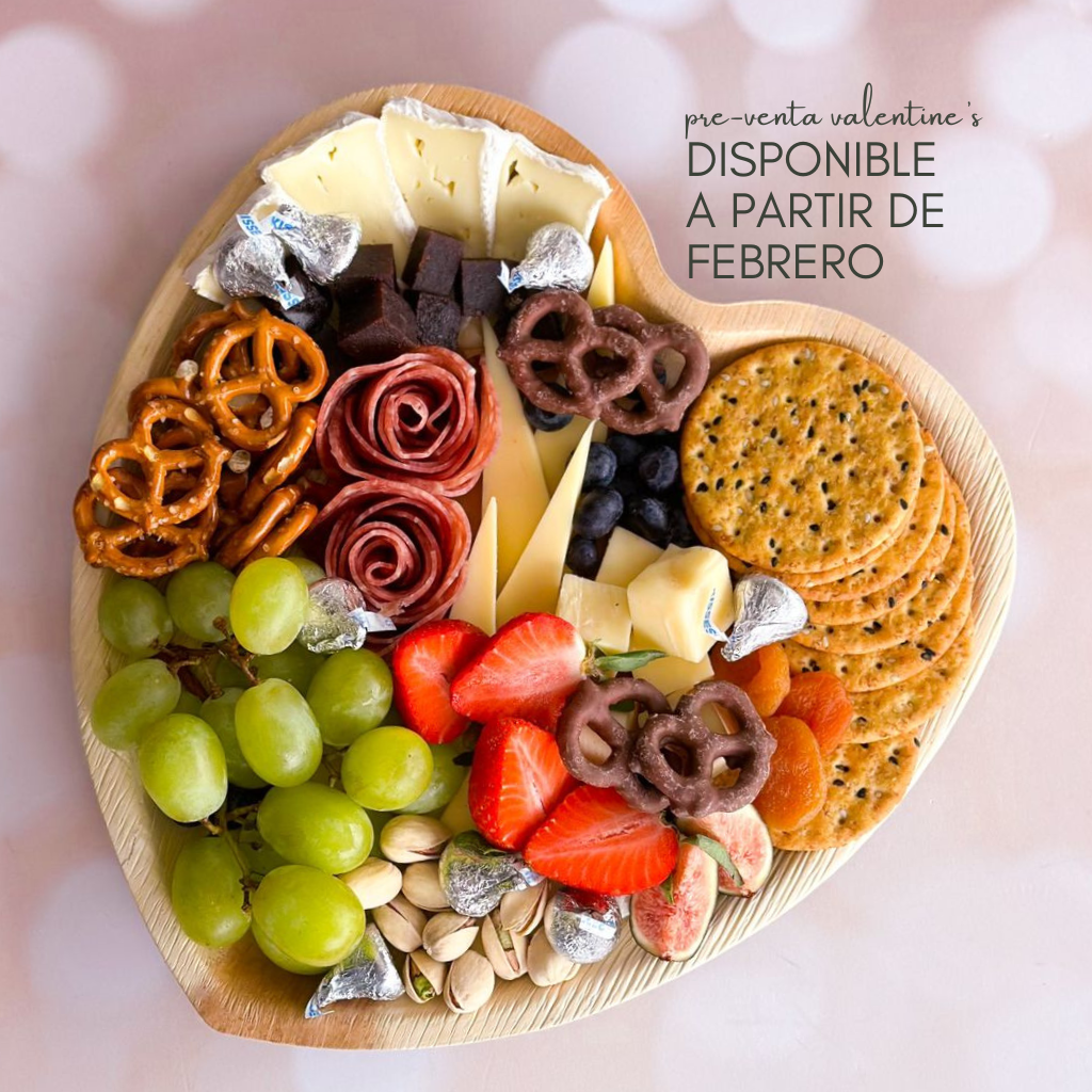 Variedad de quesos (Gouda, Chihuahua, Oaxaca y/o queso cremoso de cabra), carnes frías (salami o chorizo), ate de membrillo y complementos como frutos secos y deshidratados, fruta fresca de temporada y Galleta. Montada en una base en forma de corazón <3.
