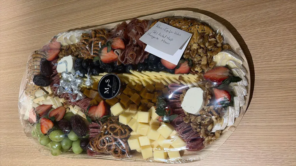 Variedad de quesos (Brie, manchego, chihuahua, cremoso de cabra, gouda, entre otros), Jamón Serrano, Salami genovés y complementos como frutos secos y deshidratados, fruta fresca de temporada y Galleta. Montado en un platón desechable elaborado con hoja de palma caída 100% natural y biodegradable